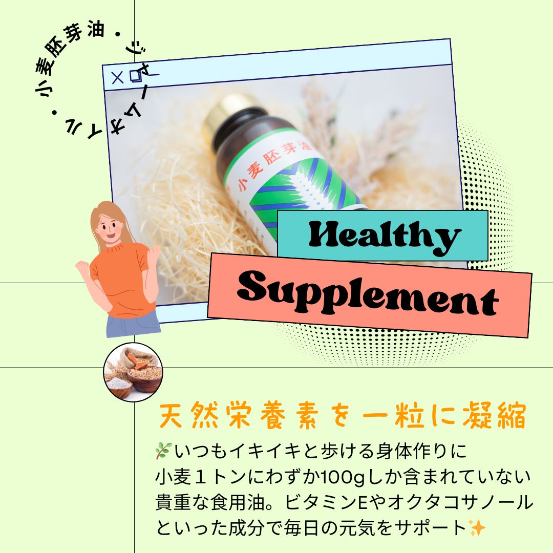 ■小麦の栄養源である小麦胚芽由来の植物油で、ビタミンE・植物ステロール・オクタコサノールなどが含まれている栄養補助食品です。